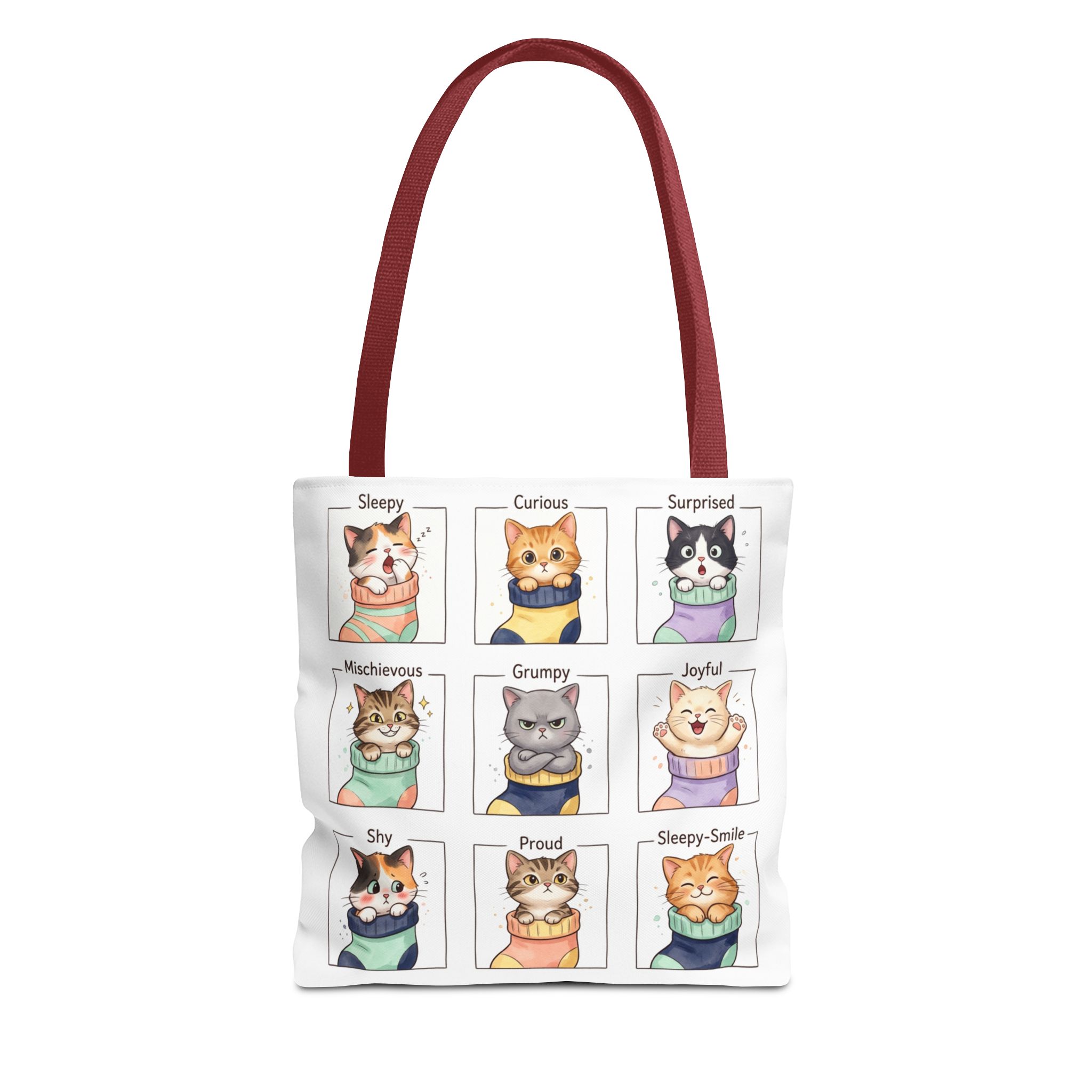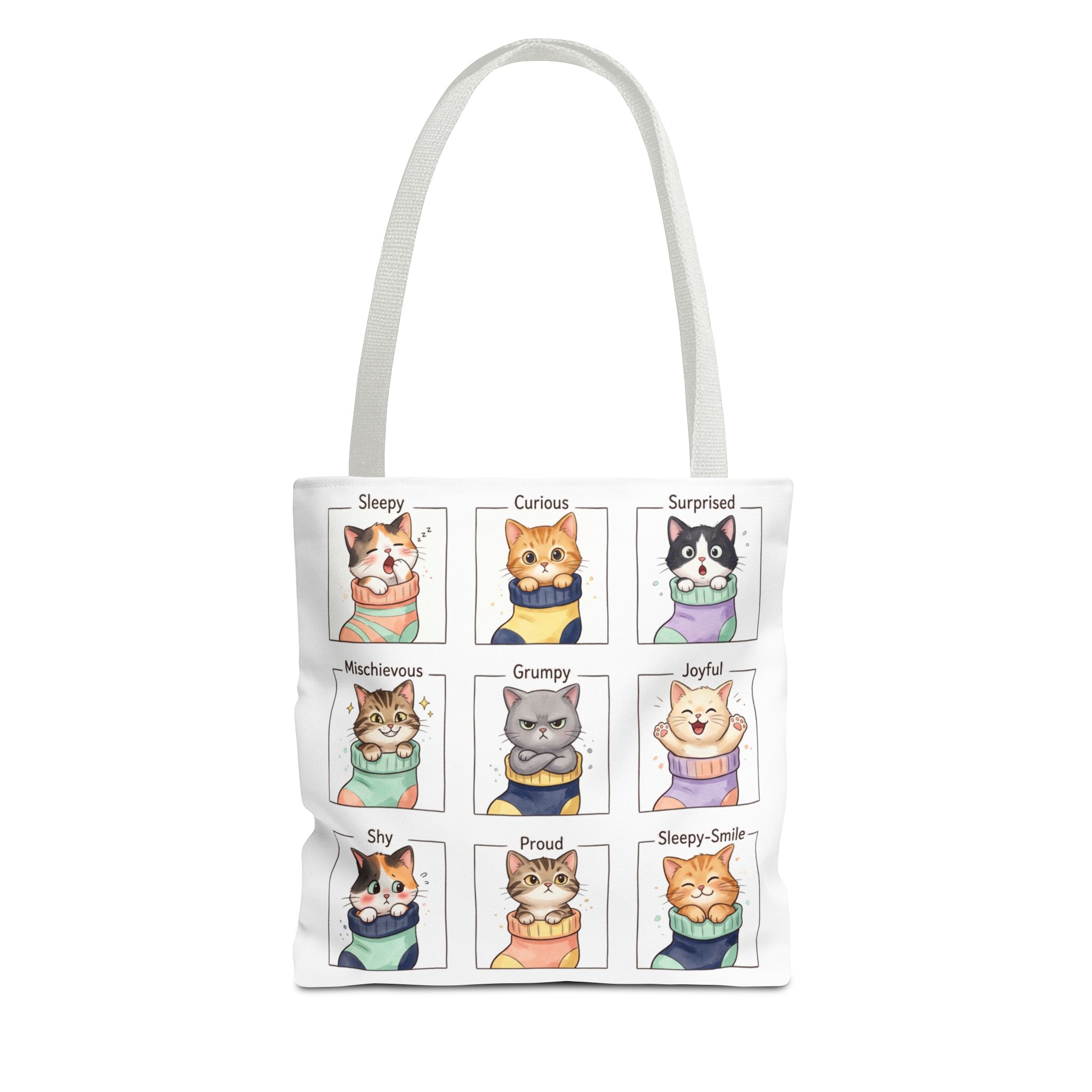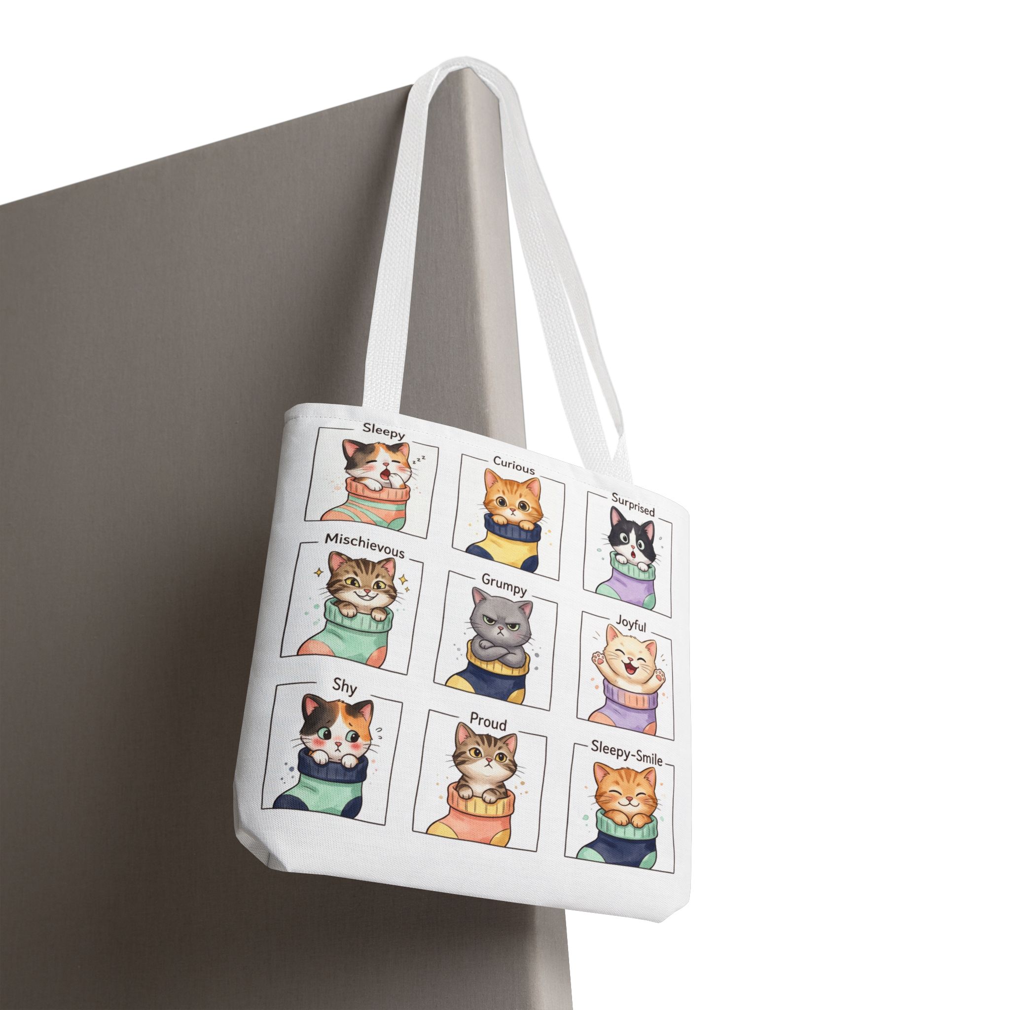 This illustrated emotions cats tote brings a little daily joy every time you reach for it. Softly stylized cat faces—curious, sleepy, mischievous, smug—peek across the fabric, turning ordinary errands into tiny moments of connection. The tote sits comfortably on a shoulder or in hand, its roomy boxed corners giving space for a sketchbook, market haul, or cozy layers. For someone who notices small moods and loves whimsical details, this bag feels like a private wink: playful, durable, and quietly expressive. Use it on slow weekend markets, library runs, or as the go-to carryall between classes or creative sessions.